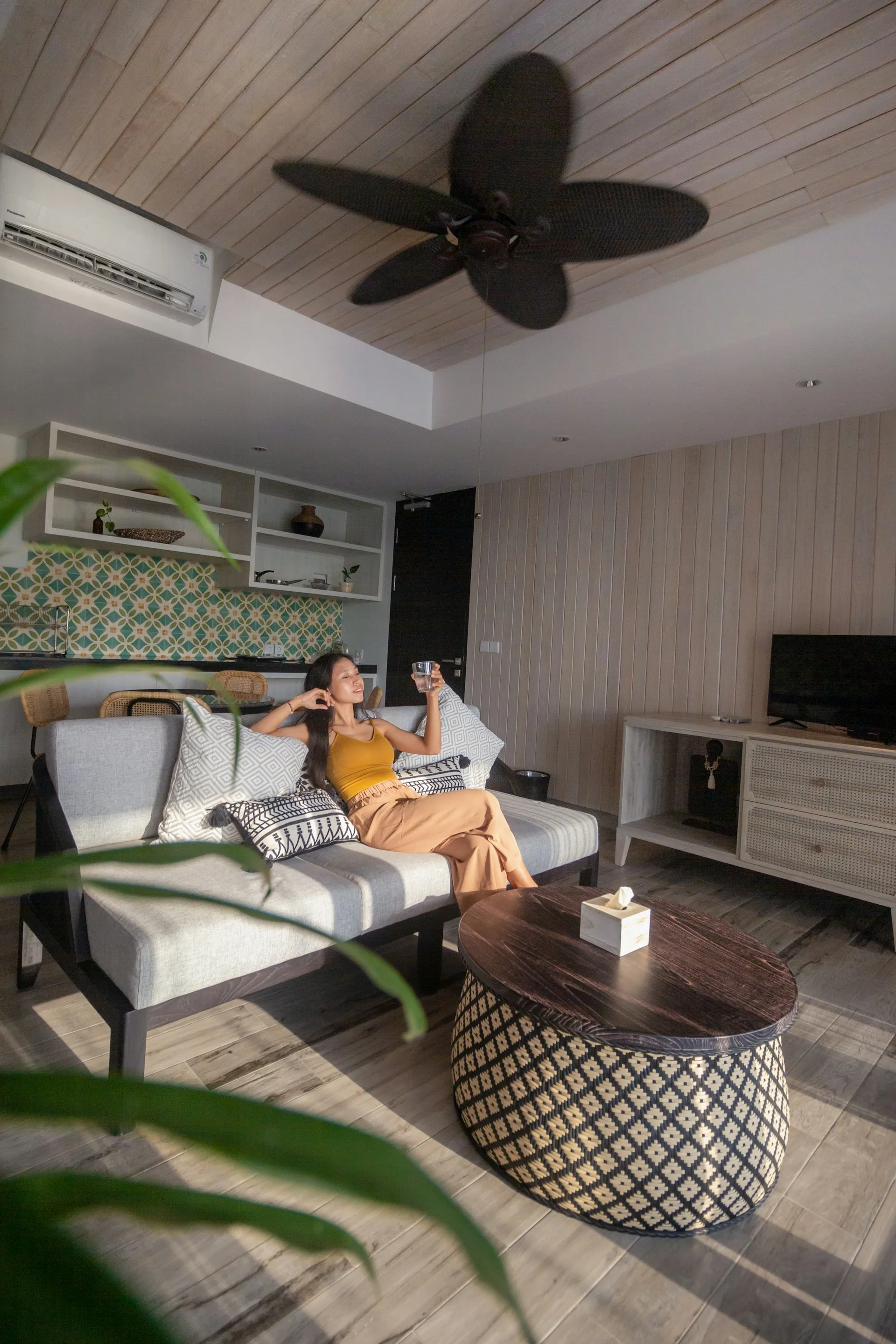 Inside, the high wooden ceiling evokes openness and spaciousness. The bathroom — complete with double sinks, a glass-framed bathtub, and views of the rice fields — is designed for slow mornings and mindful pauses. Every corner of PRANA whispers calm, clarity, and a gentle invitation to return to yourself.